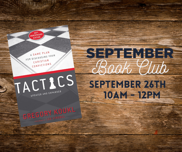 By popular demand, book club will continue into September! The book we'll be reading is "Tactics" by Greg Koukl. We'll meet at the church to discuss the book on September 28th from 10am to 12pm. A sign up sheet is still available on the Information Desk. If you need help acquiring a copy of the book, it can be provided.